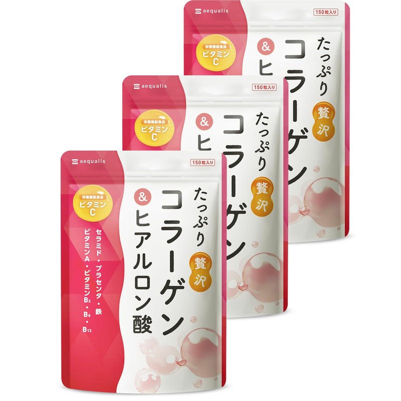 【3袋セット】aequalis たっぷり贅沢 コラーゲン サプリ ヒアルロン酸 プラセンタ ビタミンC 配合 国内製造 30日分