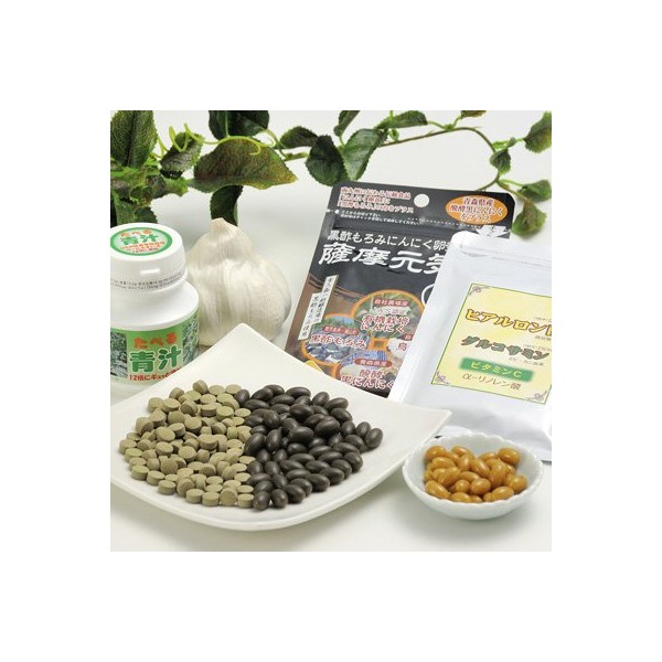 - 【数量・内容】薩摩元気玉・黒31.2g×2、青汁加工品60g、ヒアルロン酸41.4g 【賞味期間】365日 【原材料】●黒酢もろみにんにく卵黄加工品/黒酢もろみ、有機栽培ニンニク、醗酵黒にんにく、エキストラバージンオリーブ油、しそ油、烏骨鶏卵、ゼラチン、グリセリン、蜜ろう、とうもろこしタンパク●ヒアルロン酸・グルコサミン含有食品/オリーブ油、しそ油、ヒアルロン酸(鶏冠抽出物)、グルコサミン(エビ、カニ由来)、ビタミンC、卵殻カルシウム、グリセリン脂肪酸エステル、蜜ろう、ゼラチン、グリセリン●青汁加工品:有機ケール、有機さつまいも葉柄、プルラン 【仕様】掲載商品には、アレルギーの原因といわれる原材料を含んでいる場合がございます。 くわしくはお問い合わせフォームにてご連絡ください。 【お届け方法】常温