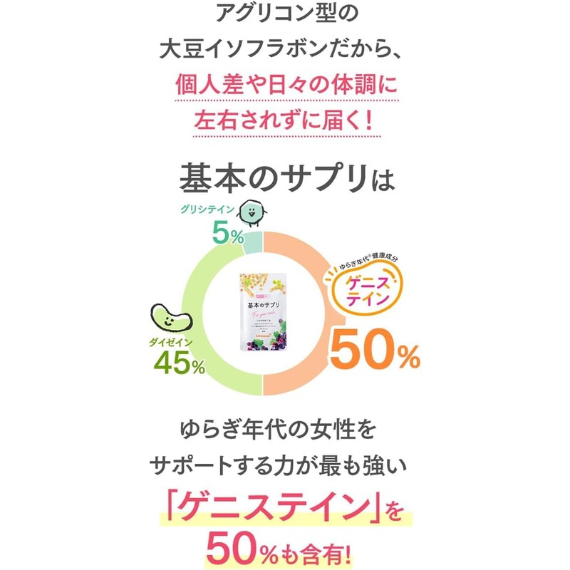 • 基本のサプリは大豆イソフラボンアグリコンを主要成分として使用しています。 大豆イソフラボンアグリコンには、3つの成分(ゲニステイン、ダイゼイン、グリシテイン)が存在します。 3つの成分の中でも最も女性をサポートする力が強いと考えられているゲニステインが キッコーマンの基本のサプリには一番多く含まれています。