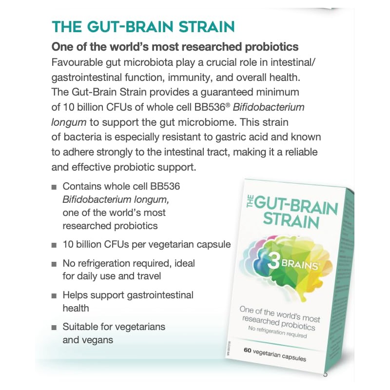 - WORLD'S MOST RESEARCHED PROBIOTIC: The Gut-Brain Strain 3 Brains Probiotic contains whole cell BB536 Bifidobacterium longum, one of the world's most researched probiotics 10 billion cfu per vegetarian capsule.