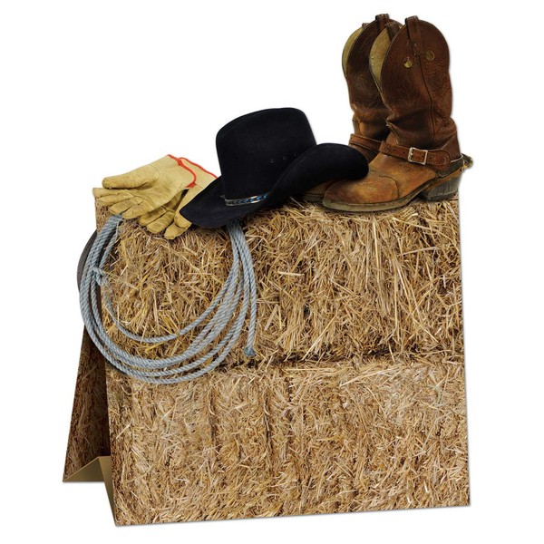 This Party Table Centerpiece is the perfect Western theme centerpiece. It measures 9.5 inches tall by 7.75 inches wide by 3.5 inches depth. The cowboy centerpiece comes flat in the package and will need to be opened up at the bottom to become 3 dimensional. Assembly is required. The boots, hat, gloves and rope are flat but printed on both sides. This detailed centerpiece will look nice sitting on a table to decorate for a Wild West Theme party.