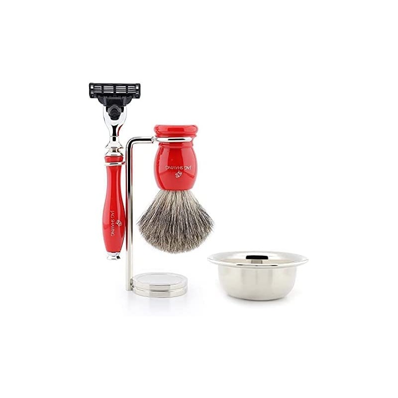 3 Edge Shaving Set with Red Badger Hair Brush and Stainless Steel Razor Stand by Jag Shaving