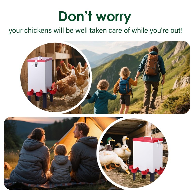- 【Stainless Steel Chicken Waterer】This metal poultry waterer is constructed with stainless steel and a rust-resistant coating,ensuring durability against corrosion,deformation,and harsh weather.Built to outlast standard plastic poultry waterers,it delivers long-term reliability while maintaining water quality.