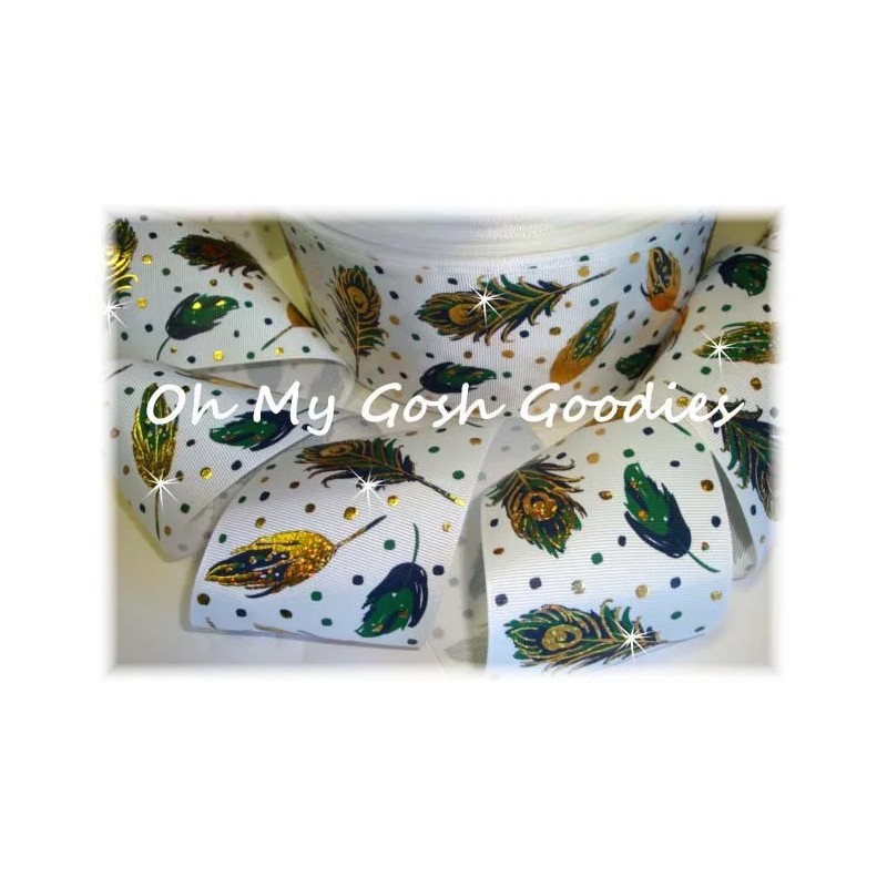 3" GLITTER PEACOCK FEATHERS BOHO CHEER DESIGNER GROSGRAIN RIBBON FOR BOW WHITE