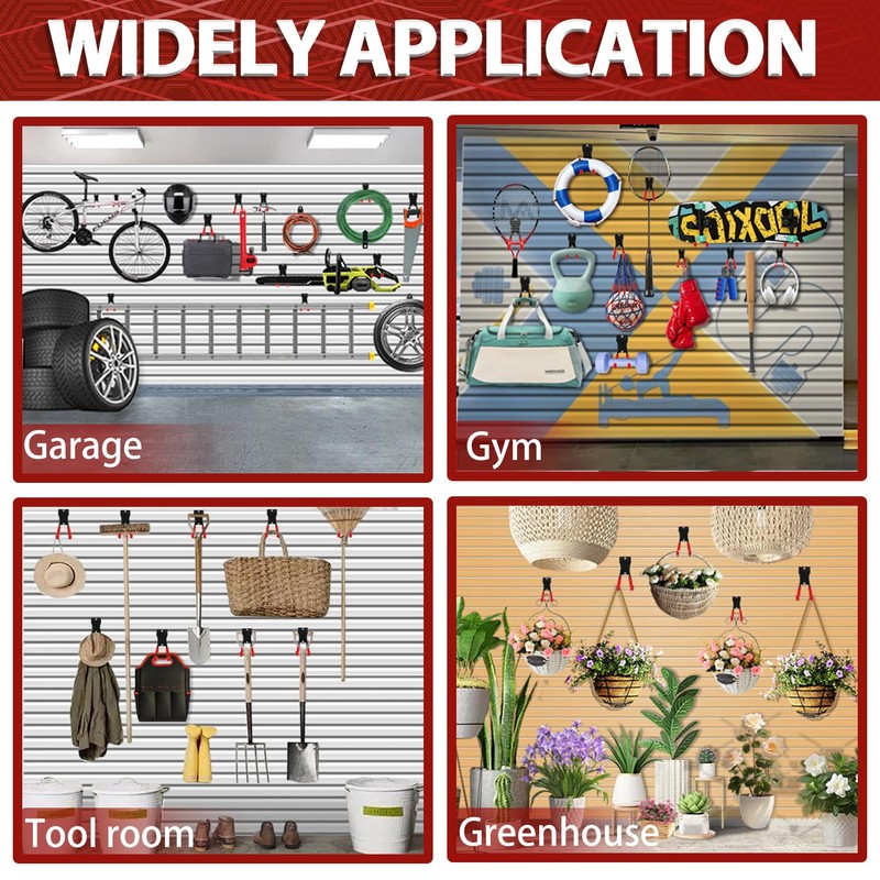- Easy to Install and Space Saving: slat wall hooks fit standard slat wall like Proslat, Handiwall, Crownwall, etc., you can directly place slat wall hanging hooks to both sides of the panel groove, fix garage hooks for hanging into the groove on the panel then press slatwall brackets down and ladder hook will fit perfectly. Then you can move garage hooks to anywhere you want to put, saving you time and effort
