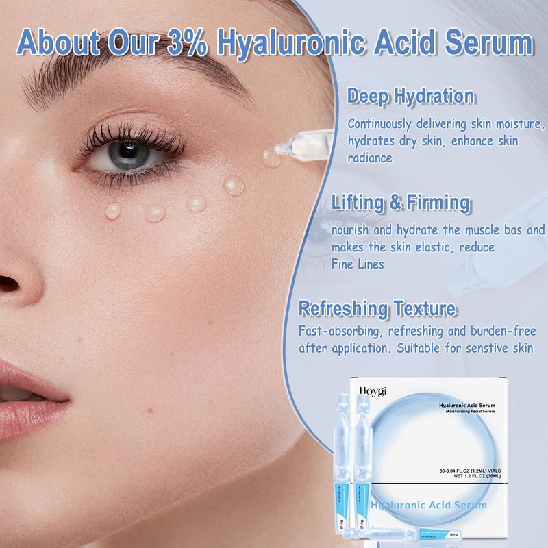 - SAFE FOR ALL SKIN TYPES: Our 3% hyaluronic acid tubes are mild and non-irritating, suitable for all skin types. Each facial serum is individually packaged, which is not only easy to carry and saves space, but also can be used fresh every time