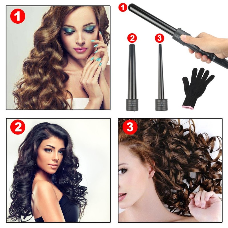 **iMissiu 3-in-1 curler is extremely versatile and every barrel will create a different type of curl: tight perm like curls, ringlet curls, spirals curls, ribbon curls, flick curls, large and bouncy curls, beach or wavy curls and finger wave type curls that will hold for ages.** **Specification:** ▶Type: curling irons ▶Power: 85W ▶Voltage: 100-240V ▶Frequency: 50/60HZ ▶Thermal conductivity material: Tourmaline ceramic ▶Ceramic Barrel Diameter: 09-18mm / 18-25mm / 25-25mm ▶Total length: 35.5cm ▶Optimal styling time: 1-2min ▶Cable Line Length: 2.5m ▶Weight: 500g **Note:** ▶Please read all instructions before using . ▶Please be careful and wear the glove when using, it's a little hot and will burn the skin if careless. It will be much better if another person can help to curve the hair. ▶Don't cover the curling wand, in order to avoid the high temperature damage the internal original ▶Always unplug after using. ▶Keep electrical products away from water. If appliance falls into water, “unplug it” immediately. Do not reach into water. ▶The curling iron is hot when in use. Do not let eyes and bare skin touch heated surface. Use the handle. ▶Before storage, allow sufficient time for appliance to cool down. Always store in a dry and safe place, out of the reach of children. **Package Includes:** ▶1 x 3 in 1Hair curler set ▶1 x User manual ▶1 x Heat Resistant Glove