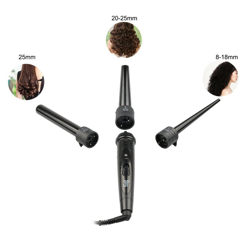 - 【3-in-1 Curling Wand Set】: The set includ 3pcs interchangeable tourmaline ceramic iron barrels, meets your different curling style needs. (9/18mm), (18/25mm), (25/25mm), These sizes give you three options. Make your hair style from waves to tight curls yourself, enjoy the endless styling possibilities at home instead of hairdressing salon, save your money and precious time.