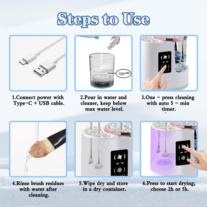 - Timing design: Makeup brush cleaning function cleaning time for five minutes, five minutes to the end of the automatic stop cleaning.Makeup Brush Dryer is divided into 2-hour timer and 5-hour timer drying, set the time to automatically stop drying