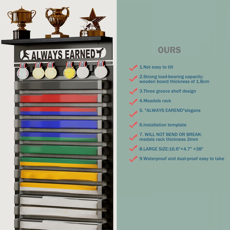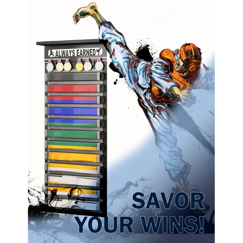 • "ALWAYS EARNED" is our taekwondo belt display with the motto inspires you to push your limits and strive for greatness, while keeping your martial arts belts, medals, and trophies organized and proudly displayed. It encourages continued practice and goal-setting towards achieving the black belt.