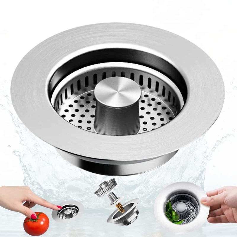 - [3-in-1 Stainless Steel Sink Drain Strainer & Stopper] This kitchen sink drain strainer combines a stainless steel pop-up stopper, anti-clogging basket, and hair catcher in one. Made of rust-resistant SUS304 steel, it traps food scraps, debris, and hair while preventing odors and clogs. Perfect for kitchen sinks, RV sinks, and utility basins.