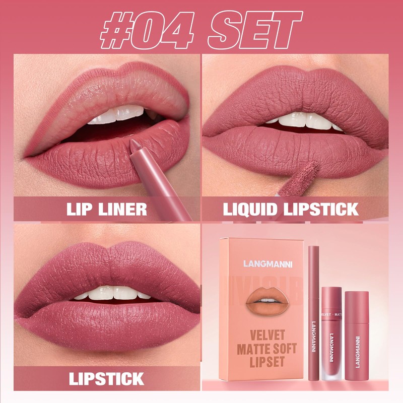 3-in-1 Matte Velvet Lipstick Set, 3 Pieces Matte Lipstick + Matte Liquid Lipstick + Lip Liner Set, Velvet Lipstick Long Lasting Lip Gloss Make Up Gift Set (#04, 1 Pack)