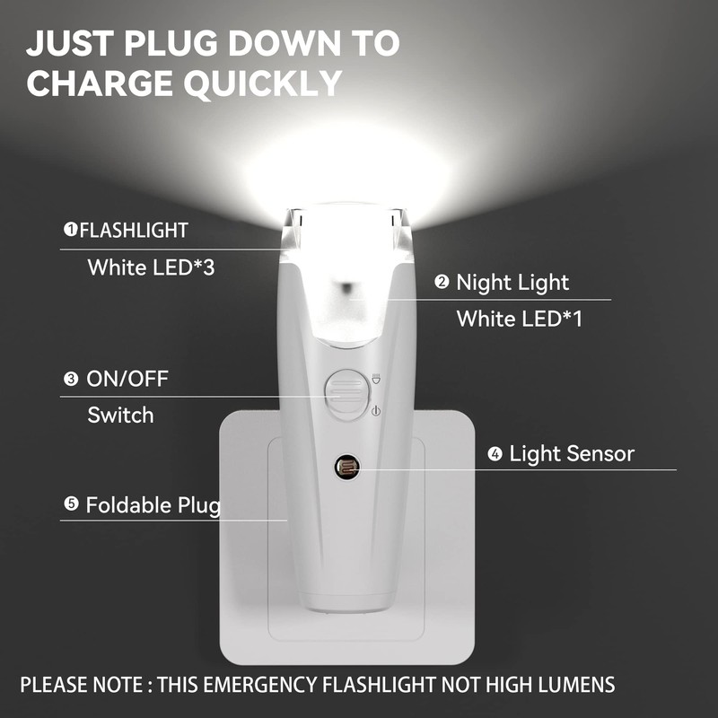 • 3-in-1 LIGHT--- It can be a automatic night light, power failure light and portable emergency flashlight.
