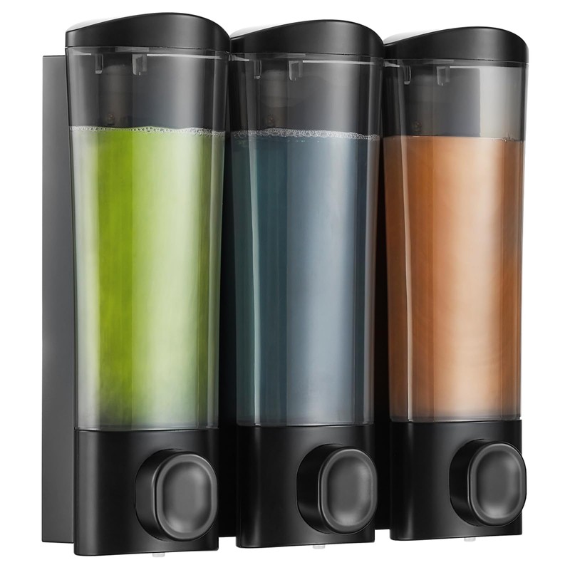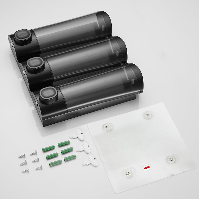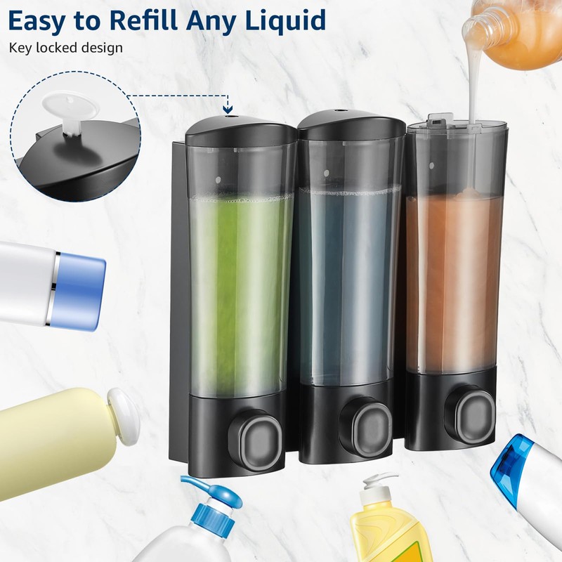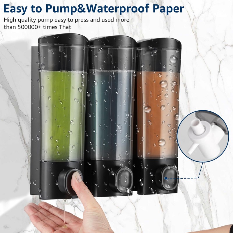 - 💎Large Capacity :Shower shampoo dispenser 3 chamber can holds 300 ML/10.14 oz (each Chamber) with large mouth bottles, easy to refill any liquid. The press type working principle makes the soap dispenser very easy to control soap distribution, avoiding leakage and waste.