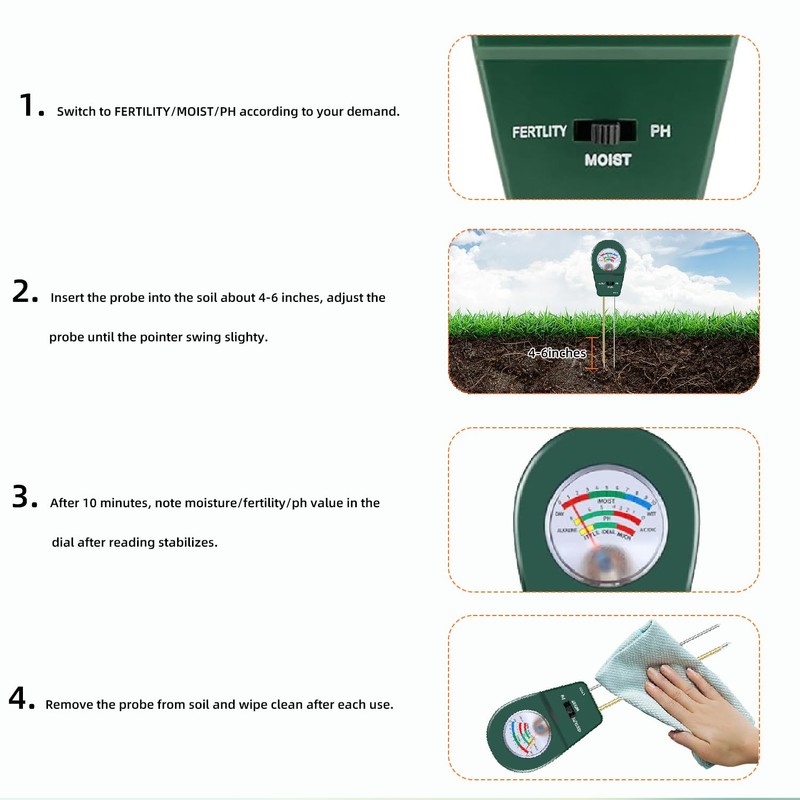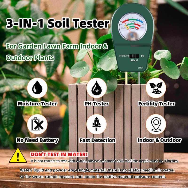 - All-in-One Soil Health Meter – Moisture, pH, and Fertility: Get instant insights into your plant’s health. This 3-in-1 soil tester accurately measures soil moisture, pH level, and fertility in seconds. Perfect for adjusting watering schedules, balancing soil acidity, and identifying nutrient deficiencies. Great for indoor plants, vegetable gardens, lawns, and potted flowers.