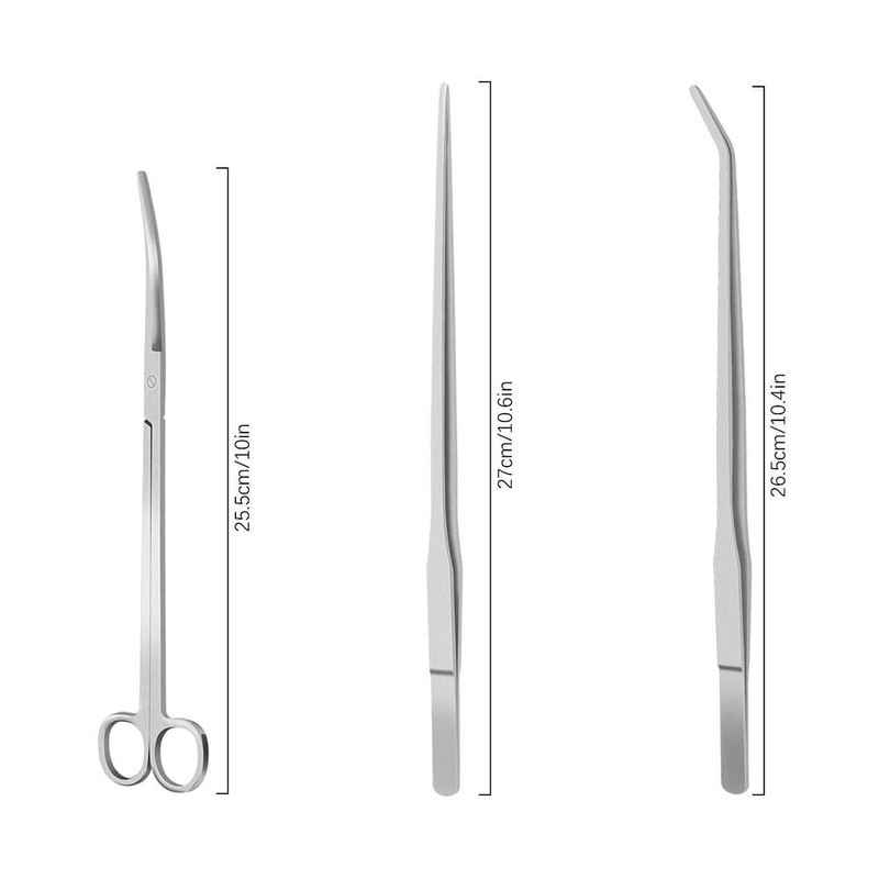 - comes with 1 curved aquarium scissor, 1 curved aquarium tweezers and 1 straight fish tank tweezers