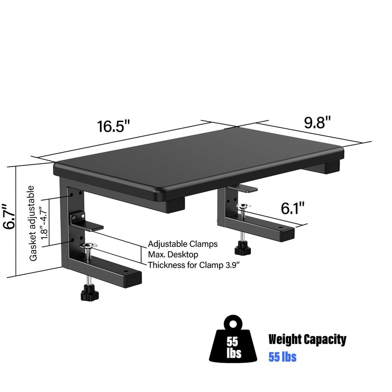 - Sturdy C-Clamps: Two durable C-clamps are not only easy to install, but also securely fasten to your desktop. They can be clamped and can be turned inward to the edge of the desktop, adding a 16.5‘ x 9.8’ high platform and additional storage space, perfect for holding laptops and monitors