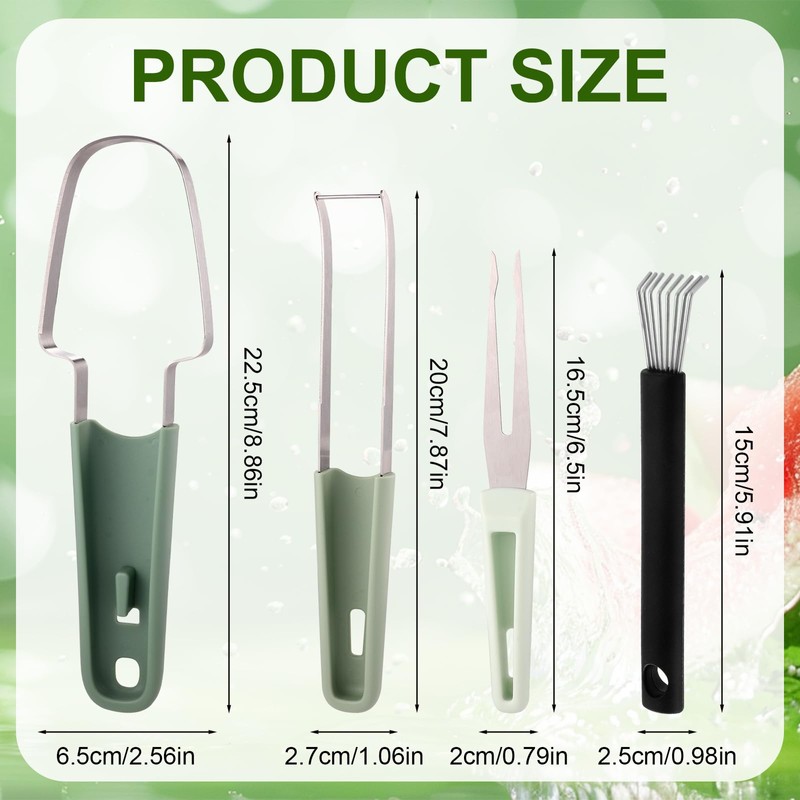 Product Size: watermelon popsicle cutter: 22x6.7cm/8.66x2.64in, watermelon cube cutter: 20x2.7cm/7.87x1.06in, the fork: 16.5x2cm/6.49x0.79in, seed remover: 15x2.5cm/5.91x0.98in