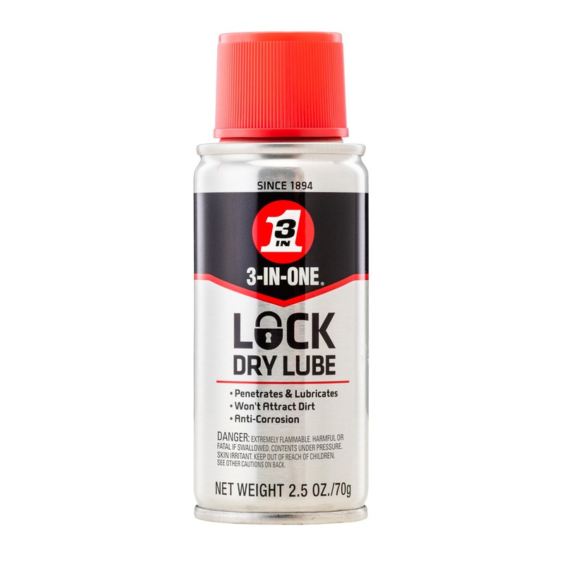 Use 3-IN-ONE Lock Dry Lube to loosen, lubricate and protect home, auto and commercial locks. Easily reach into narrow lock mechanism with the attachable straw or use the wider spray pattern to refurbish and protect the entire lock. 3-IN-ONE Lock Dry Lube dries clear to the touch within minutes and is safe to use on metal, wood and most plastic surfaces.*