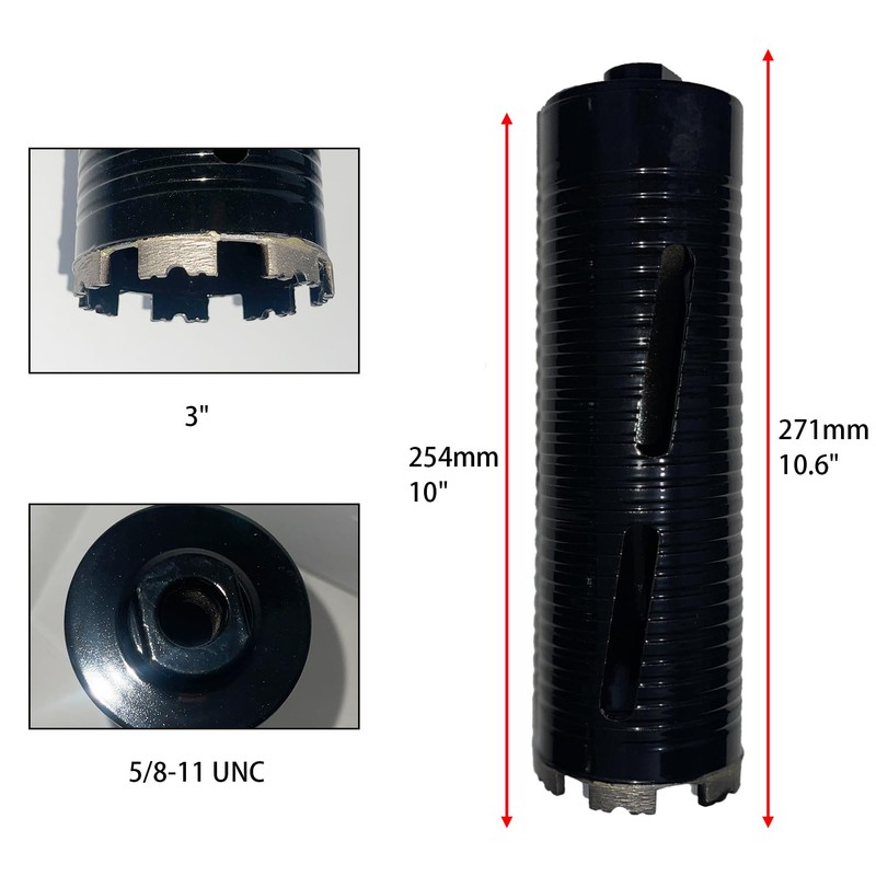 - Dry Drill Core Bits for Professionals: diamond core drill bit with 3 inch (76mm) diameter and 10.6in/271mm total length