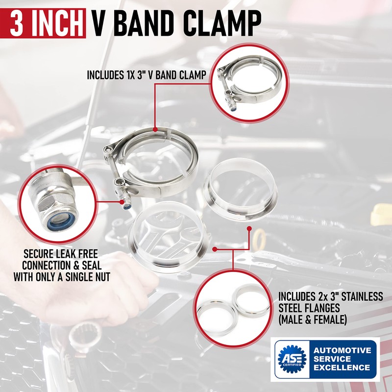 - 3 Inch Stainless Steel Exhaust Clamp Kit - Complete V-band kit is ideal for performance exhaust systems, downpipes, catback exhausts, turbo back exhausts and more. High quality CNC stainless steel flanges provide a leak free exhaust seal with no gasket required. The V-band clamp allows you to quickly connect and disconnect exhaust pipes without having to fumble with nuts or bolts.