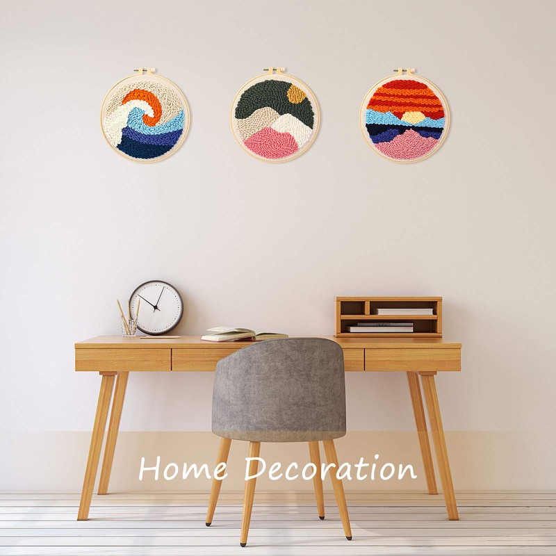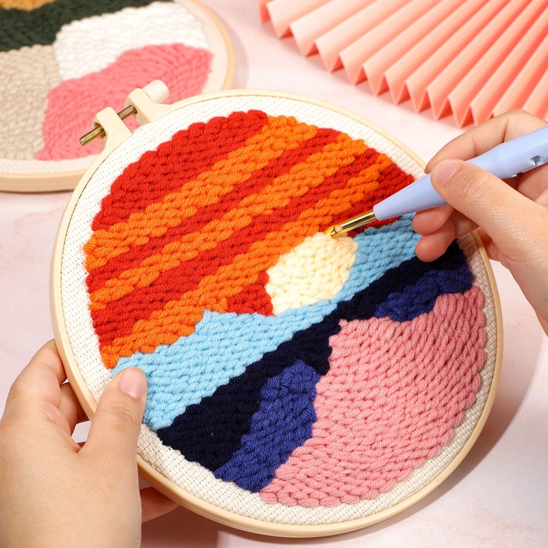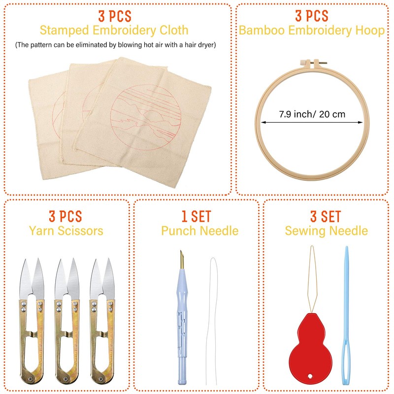 - Lo que obtienes: recibirás 1 bolígrafo de bordado ajustable, 3 juegos de agujas de punzón para principiantes, cada juego incluye el paño bordado, paquete de hilo de algodón, aro de bordado (20 cm), tijeras en forma de U, aguja de perforación, aguja de costura e instrucciones (idioma español no garantizado), una combinación completa y rica hace que sea fácil de operar, bien ajuste para principiantes de bordados