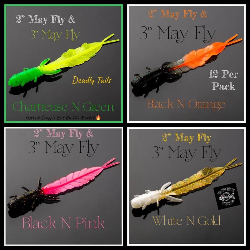 3” May Fly Series 10 Per Pack - One of the hottest crappie & panfish baits in our store. - May Fly Color: Bluegilll & Chartreuse