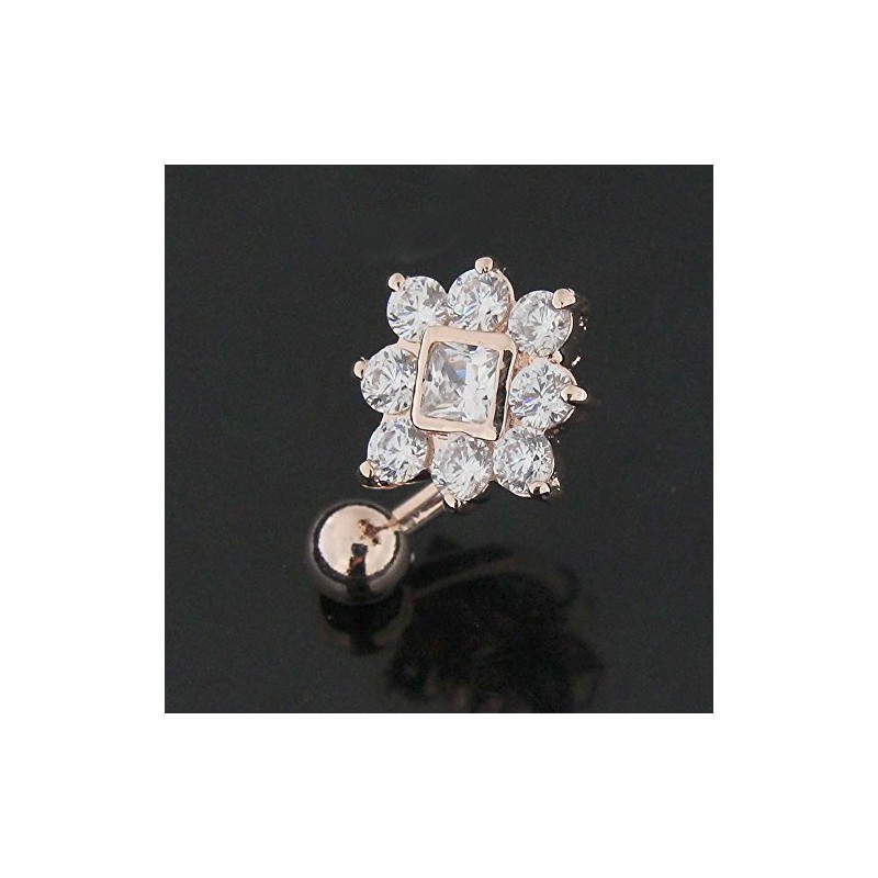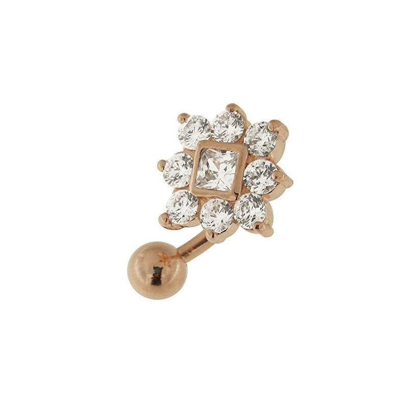 3 Micron 18K Rose Gold Plated Clear CZ Stone Square Flower Reverse Bar Design 925 Sterling Silver Belly Button Ring