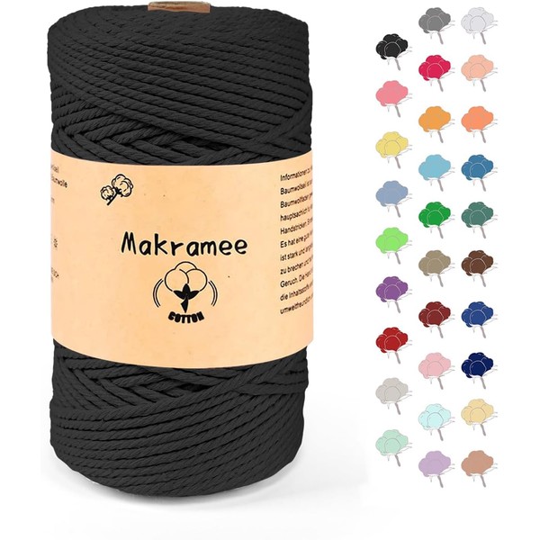 3 mm x 200 m Macrame Yarn, Cotton Yarn, Macrame Cord for Crafts, Plant Hangers - Black