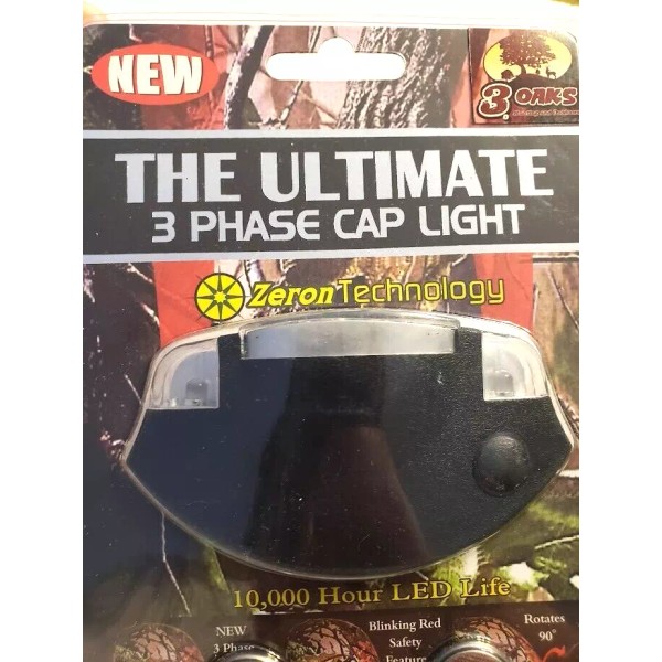 3 Oaks Ultimate 3 Phase Cap Light with Zeron Technology is a powerful headlamp designed for outdoor activities like camping and hiking. The headlamp is powered by batteries and features advanced technology for enhanced visibility and performance. With the 3 Oaks brand name attached to it, you can trust in the quality and reliability of this headlamp for your adventures in the great outdoors.