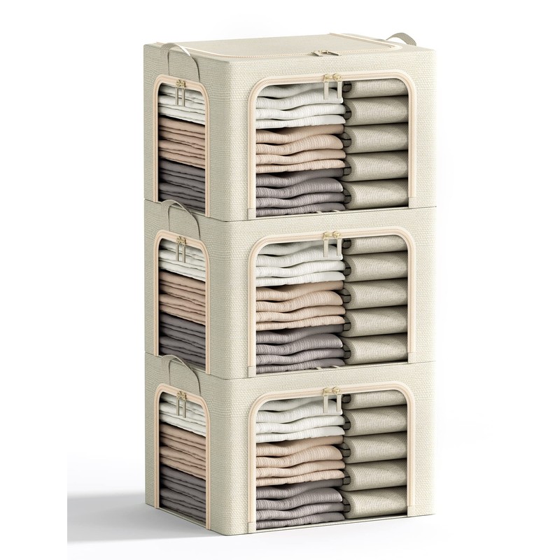 3 Openings Clothes Storage Bins with Metal Frame, Foldable Storage Bin for Clothes, Clothing Storage Bins with Lid, Linen Storage Box With Clear Window& Zippers& Durable Handles.(3 Pcs,Beige,40L)