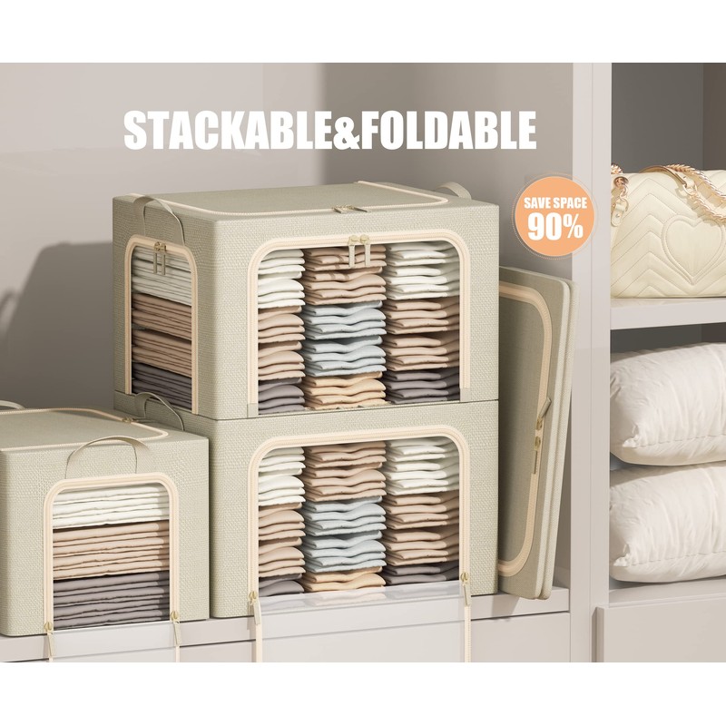 3 Openings Clothes Storage Bins with Metal Frame, Foldable Storage Bin for Clothes, Clothing Storage Bins with Lid, Linen Storage Box With Clear Window& Zippers& Durable Handles.(3 Pcs,Beige,40L)
