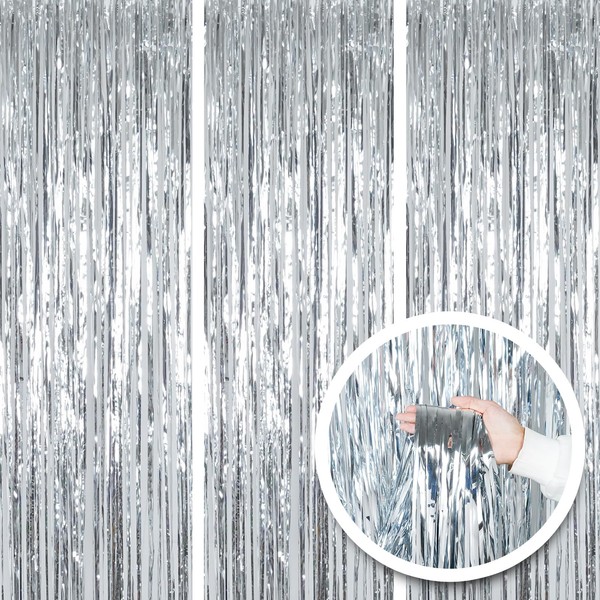 3 Pack 3.2ft x 8.2ft Silver Tinsel Foil Fringe Curtains,Silver Photo Booth Backdrop Streamers for Christmas Birthday Party Decorations