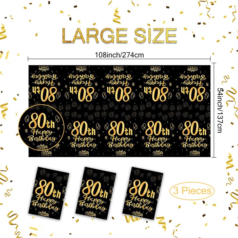 - You Will Get - Package include 3pcs black gold 80th birthday table decorations. 108 * 54 inches, suitable for most rectangular tables.