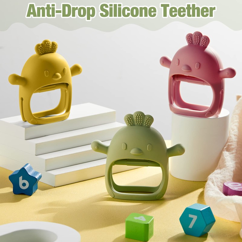 3 Pack Baby Teether Teething Toys for Babies 0-6 Months Baby Teething Toy Silicone Anti Dropping Infant Hand Teether Pacifiers Wrist Hand Chew Toys for Sucking Needs (Olive Green, Red, Yellow, Chick)