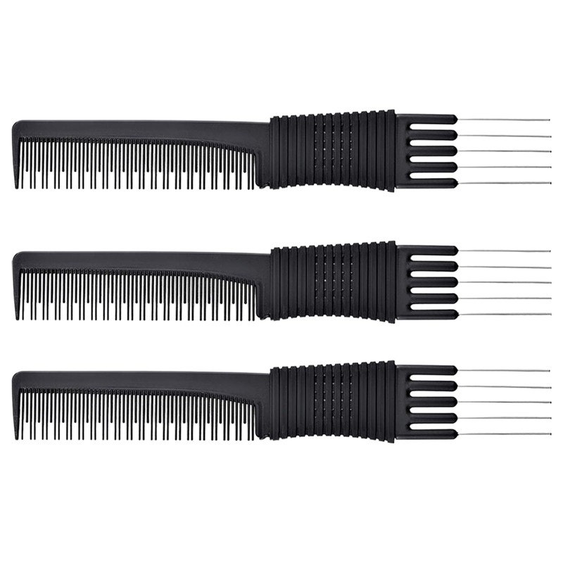 3 Pack Black Carbon Lift Teasing Combs with Metal Prong, Salon Teasing Back C...