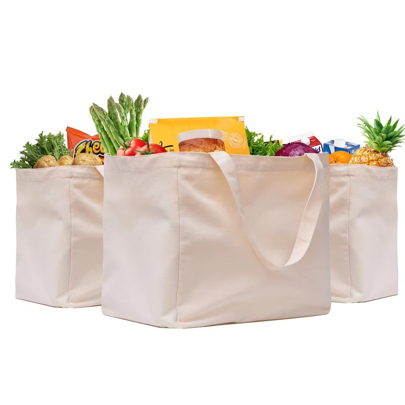 3 Pack Canvas Shopping Bags for Groceries, Holds 60 lbs Heavy Duty Reusable Canvas Grocery Bag, 8.3 gal Multi-Purpose Washable Canvas Grocery Bags Reusable Shopping Bags with 5 Pockets, Off white