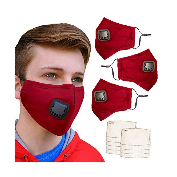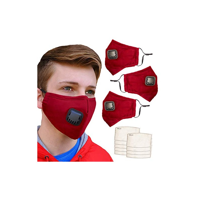3-Pack Cloth Face Mask with Valve, Adjustable Ear Loops, Comfortable Nose Wire and (9) PM 2.5 Filters (Red)
