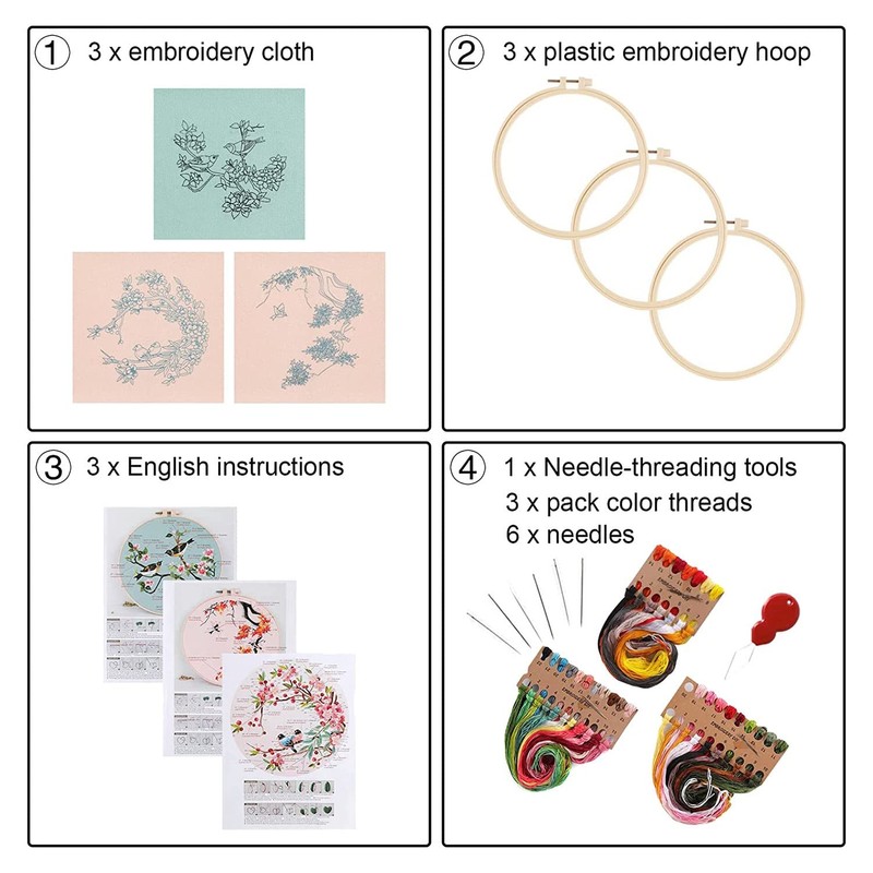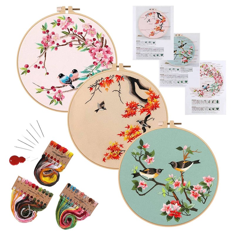 3 Pack Embroidery Kit for Beginners, Kits for Adults Include 3 Embroidery Cloth with Birds Pattern