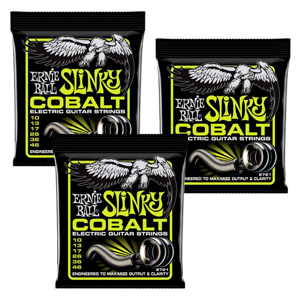 3 PACK Ernie Ball Cobalt P02721 Regular Slinky Electric Guitar Strings Ernie Ball Cobalt Slinky Electric Guitar Strings provide an extended dynamic range, incredible harmonic response, increased low end, and crisp, clear highs. Cobalt provides a stronger magnetic relationship between pickups and strings than any other alloy previously available. Cobalt Slinky guitar strings are also soft and silky to the touch, making string bending a breeze. Gauges .010, .013, .017, .026, .036, .046 Includes (3) Packs of Strings