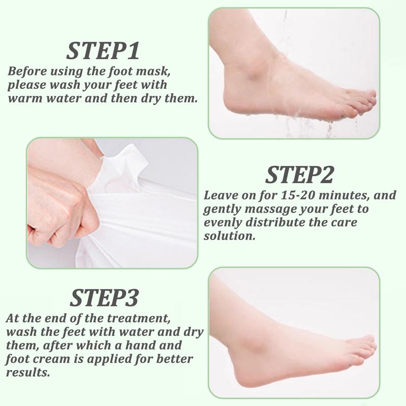 - Ease of Use: Our foot mask socks harness the natural exfoliation process of your skin, delivering baby-soft feet through a straightforward three-step routine – soak, apply, and rinse. Begin by soaking your feet in warm water for 15 minutes before applying the exfoliating foot mask. Leave it on for 60-90 minutes, and you can expect visible results within just 7 days. Effortlessly worn, with adhesive seals at the opening that firmly stay in place without slipping off.