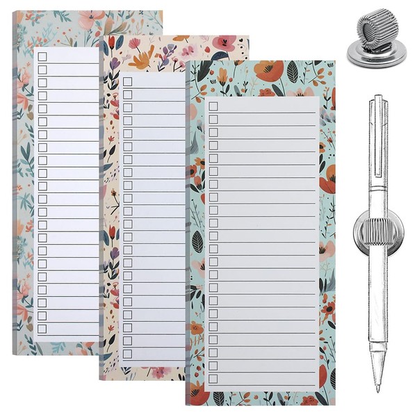 3 Pack Magnetic Shopping List Pad and 1 Magnetic Pen Clip Floral Theme Grocery List 150 Tear Off Sheets Memo Notepads for Fridge Locker Cabinet-8.9 x 21.3cm