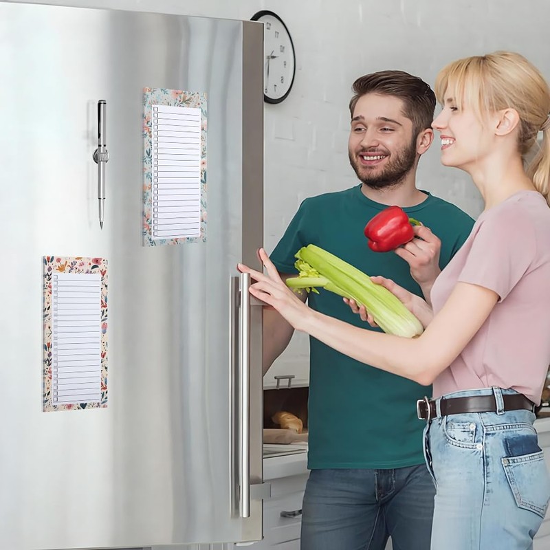 - PACKAGE CONTENT:Package includes 3 pack magnetic shopping list pads and 1 magnetic pen clip,50 sheets paper each pad,totally 150 sheets.Each sheet has 22 lines for writing with a checkbox on the left side.The magnetic pad measures about 3.5 x 8.4inch, enough space for writing