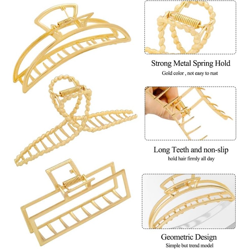 - 💄【Diverse Geometric Shapes】: This set includes three metal gold hair claws with distinct geometric designs - moon, cross, and square. Each shape offers a unique style, allowing you to change up your look effortlessly for different days or events.