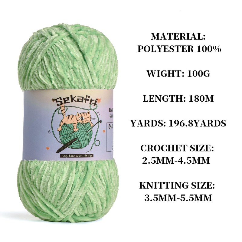 - [Chenille Yarn] is a high quality material made of 100% polyester. One roll weight: 100 grams (3.53 ounces); Length: 180 meters (196.8 yards), Applicable knitting needle size: 5-7mm/US 11, Crochet hook size: 3.5-4.5mm/US 7.5-8.
