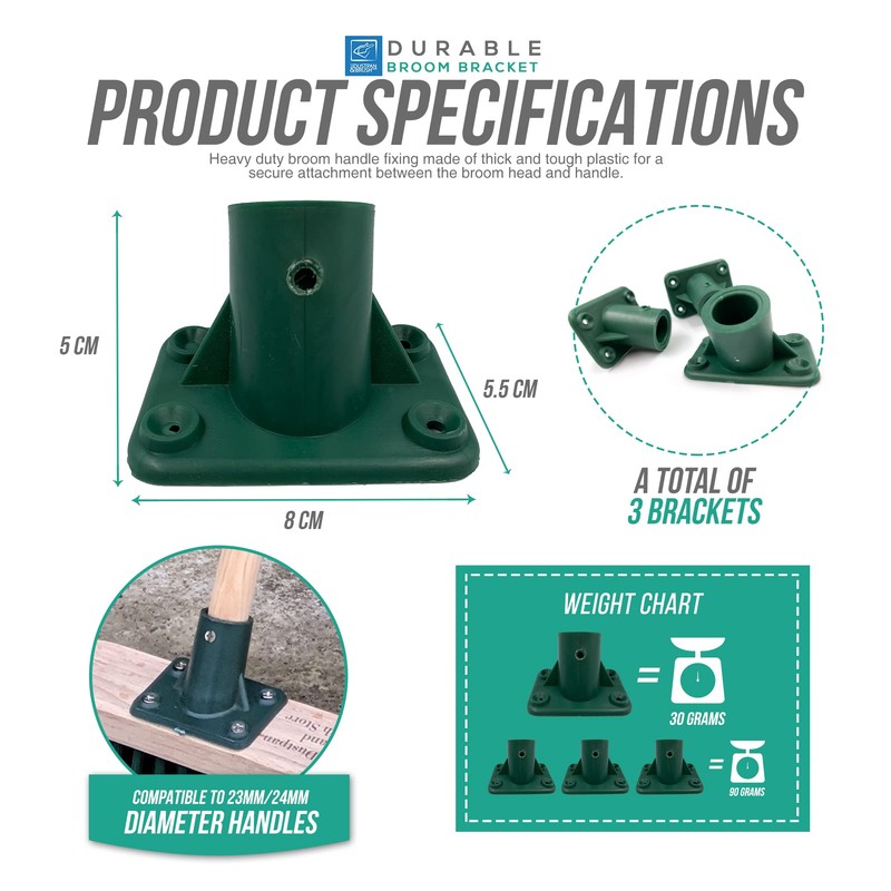 - Durable Plastic Broom Bracket – Heavy duty broom handle fixing made of thick and tough plastic for a secure attachment between the broom head and handle.