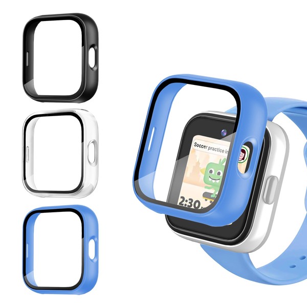 3 Pack Protective Case Compatible for SyncUp Kids Watch Screen Protector, Hard PC Bumper Cover Built-in Tempered Glass for Sync UP Kids Watch Accessories-Black+Clear+Blue