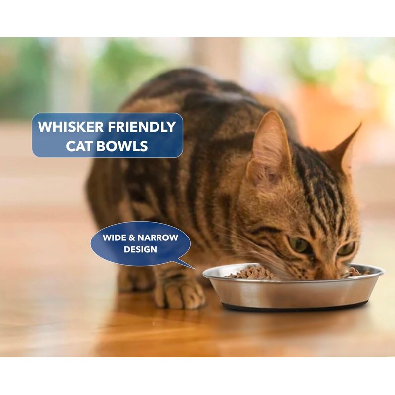 - (Whisker Fatigue) These bowls are wide , shallow and flat making them very whisker friendly. The width (5.98 inches) ensures your cat’s whiskers won’t rub against the edges causing stress and anxiety while your cat is eating food.