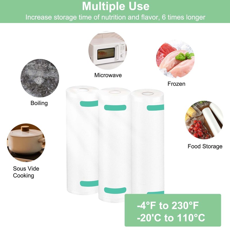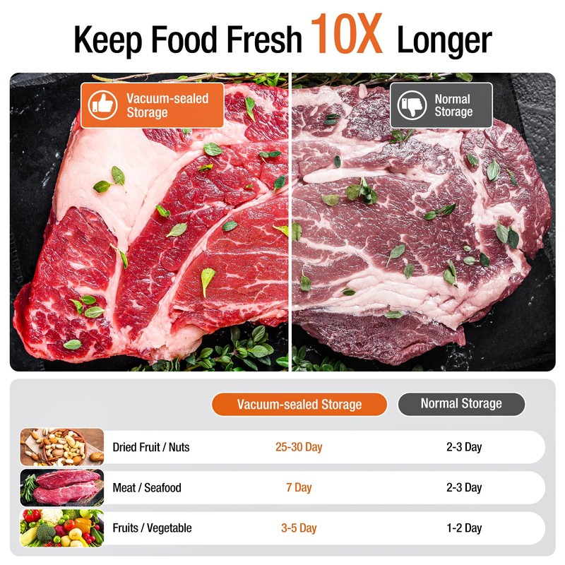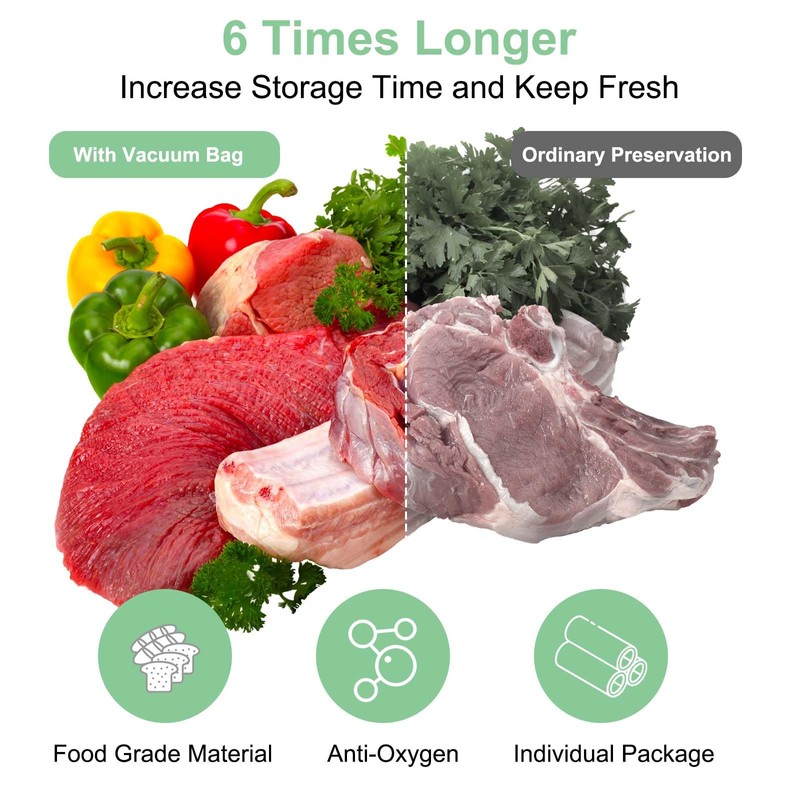 - Long-term Preservation: Prolong food shelf life 3 - 6 times, preserve freshness, nutrition and flavor of food. Eliminate freezer burn and dehydration. Airtight and waterproof materials prevent leakage.