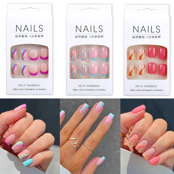 3 Packs (72 Pcs) Press on Nails Short Square Fake Nails Colorful Swirl Lines Exquisite Nails Fresh And Natural Manicure Fashion Design Full Cover Stick on Nails For Women And Girls